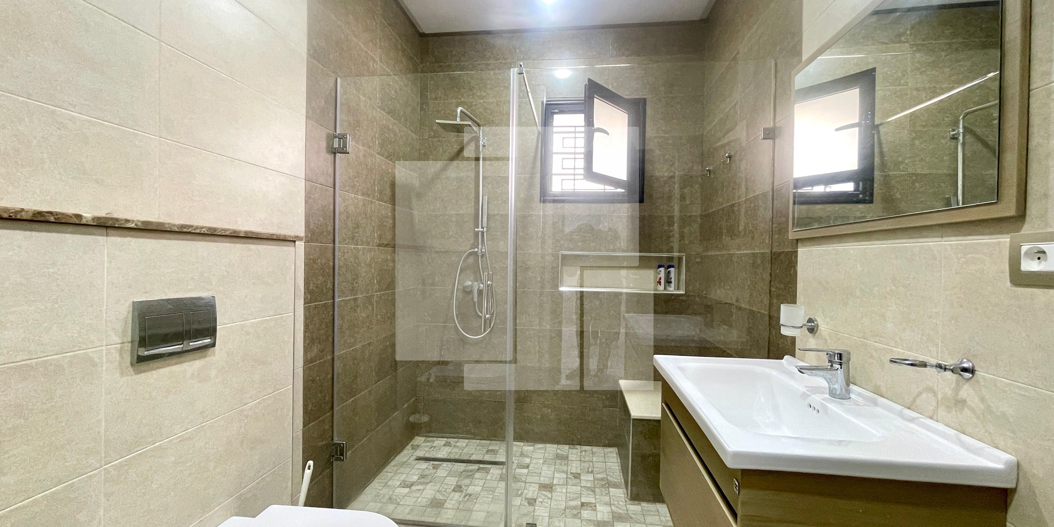 À l’étage, on trouve deux appartements S+2 indépendants, dont chacun se compose d’un salon, d’une cuisine avec séchoir, de deux chambres à coucher et d’une salle d’eau avec douche.