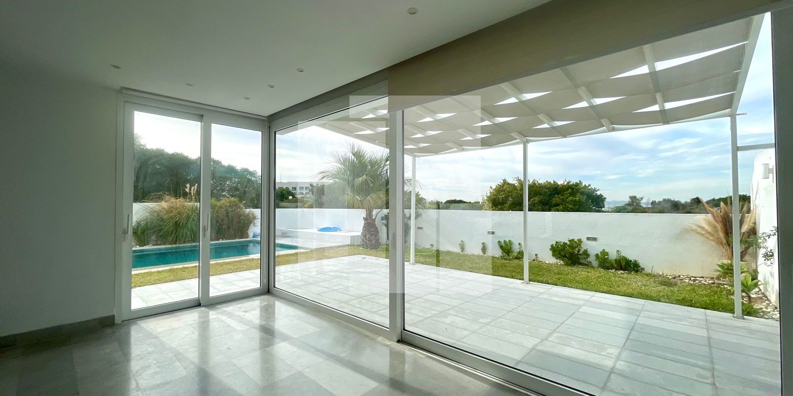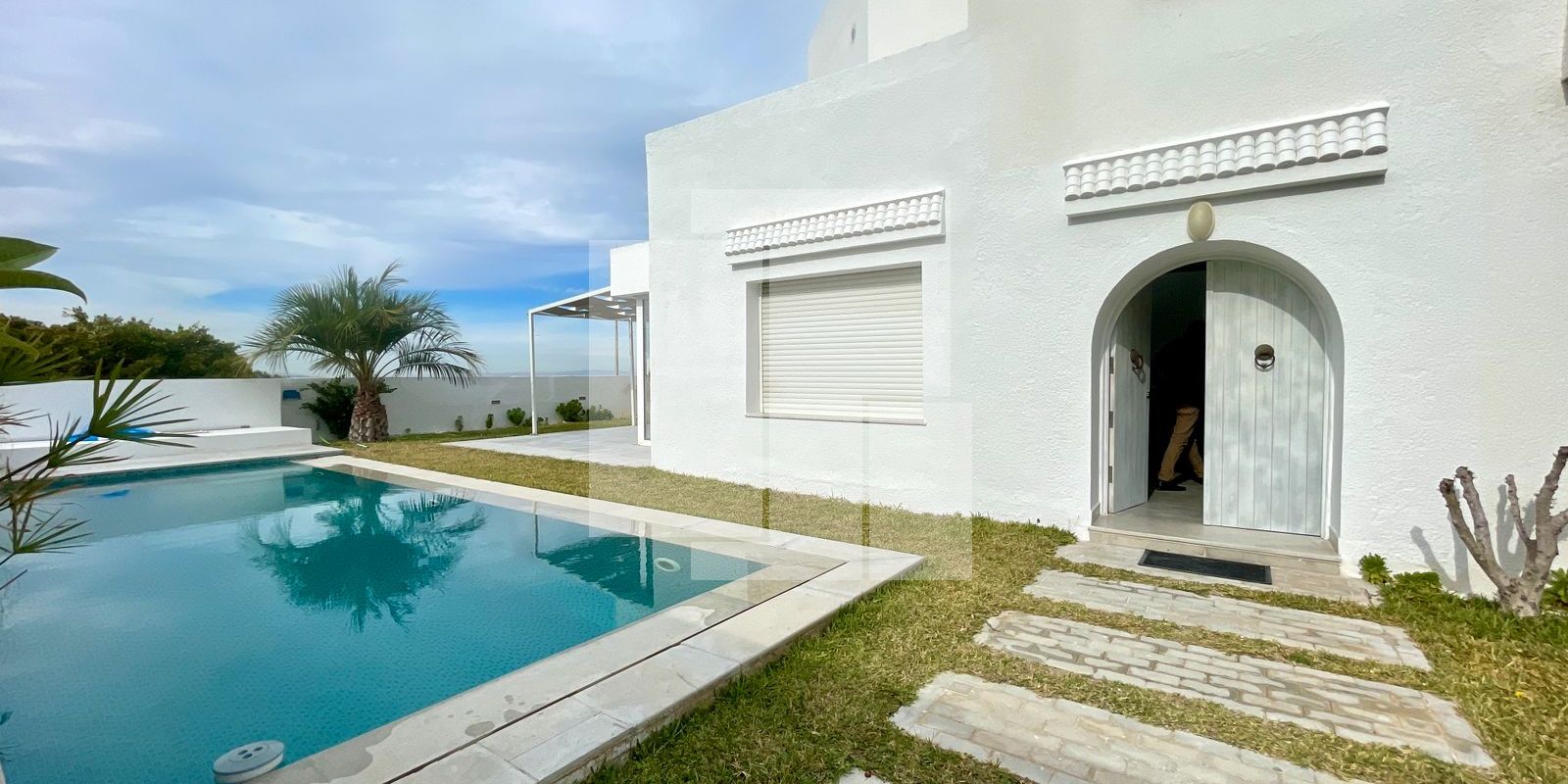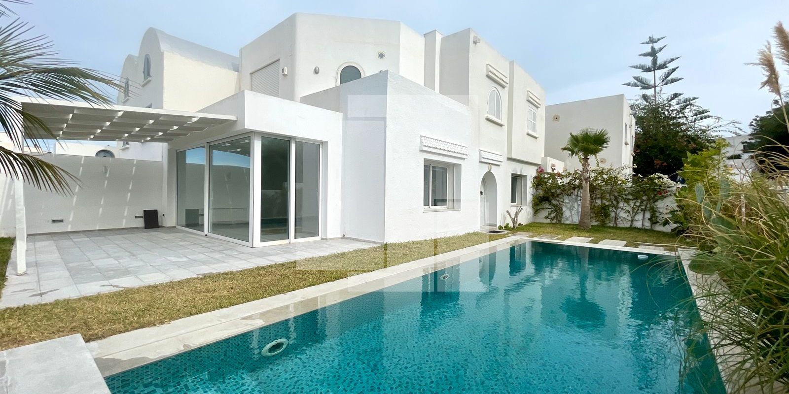 À l’extérieur, l’espace de vie se prolonge avec une agréable terrasse aménagée, un jardin verdoyant et une piscine privée.