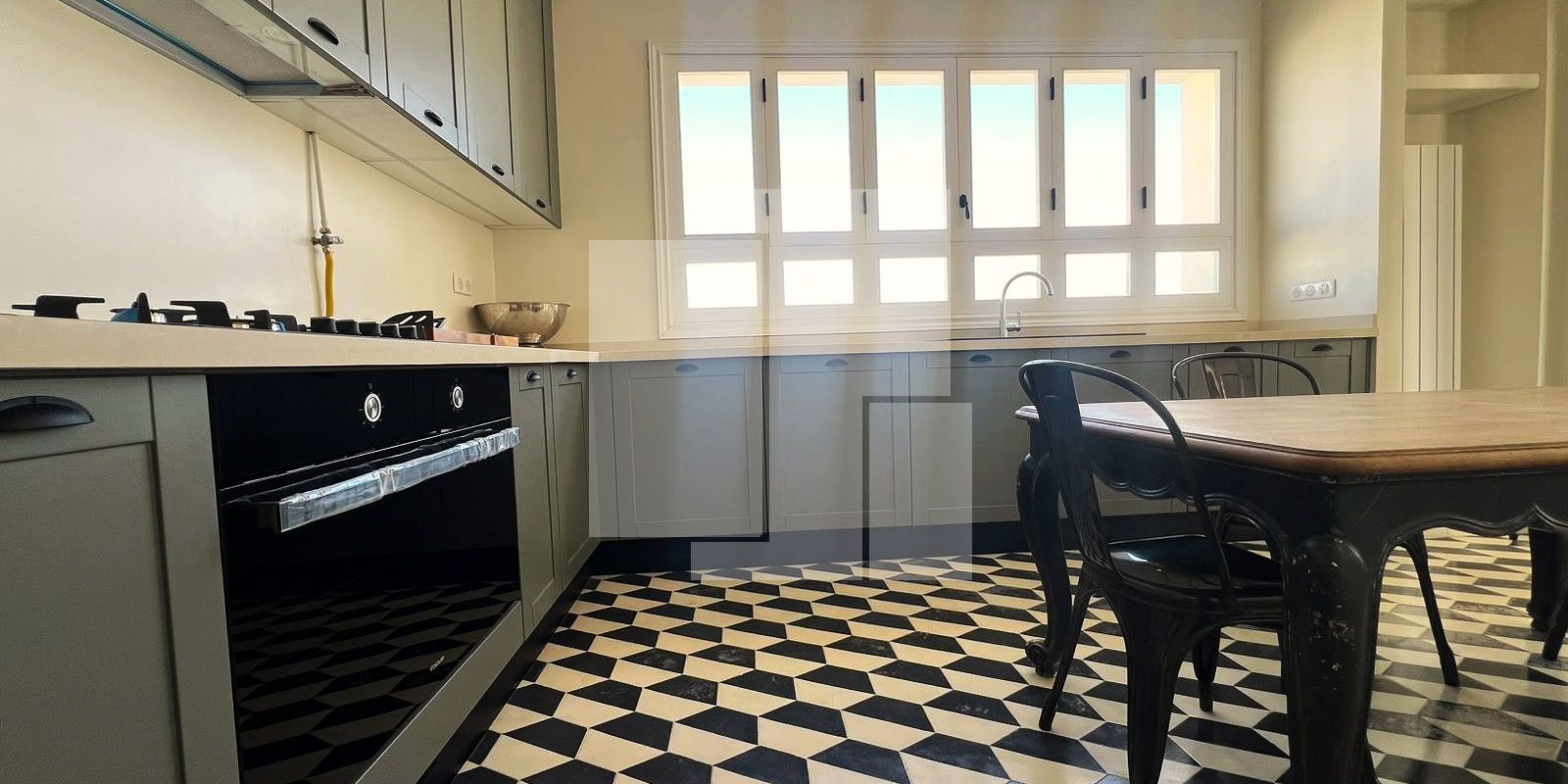 Attenante au salon, la cuisine se présente comme un véritable cœur culinaire, où l’esthétique rencontre la fonctionnalité. Son sol distinctif aux motifs géométriques captivants en fait un point fort visuel, tandis que son agencement entièrement équipé d’appareils de qualité supérieure assure une expérience de vie des plus agréables et pratiques. Pensée pour les amateurs de gastronomie comme pour les repas quotidiens, elle offre un espace optimisé et un design contemporain qui inspire la créativité culinaire.